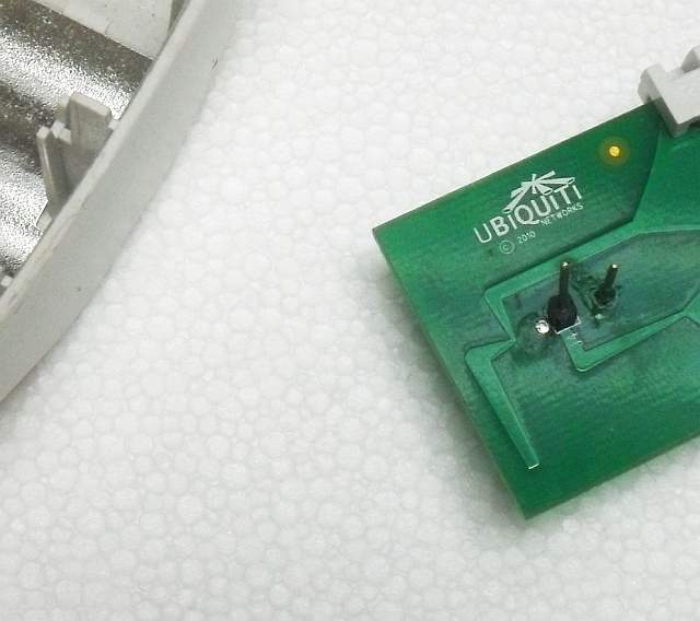 Retiramos el blindaje de la etapa de RF y ahí está el corazón del sistema, un chip Atheros bibanda, es decir, que el mismo chip trabaja en 2,4 o en 5 GHz según la configuración del dispositivo. Un poquito a la izquierda, se aprecian los conectores U.FL que permiten conectar antenas externas, aunque en este caso están desactivados mediante un pequeño puente SMD colocado en la placa, para utilizar las antenas integradas.