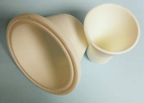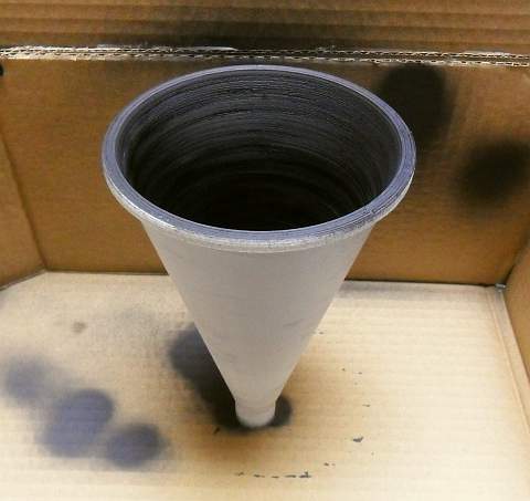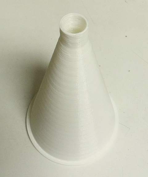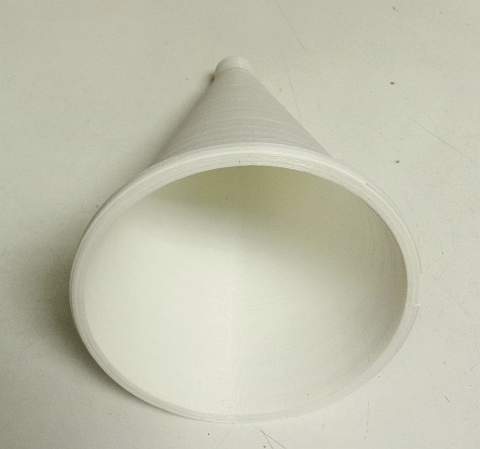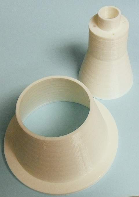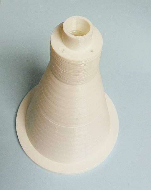 Por un lado ofrece una construcción mas robusta, lleva incorporado un soporte para alojar la bocina en el hueco de un LNB universal, sobre un reflector offset y… ha sido construido en dos piezas, para testear la viabilidad de construir elementos cuyas dimensiones excedan la capacidad de la impresora 3D.