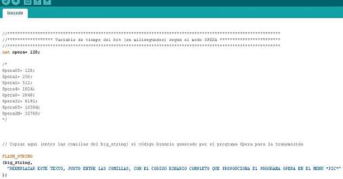 Solo hay que copiar y pegar en el sketch de Arduino, el código que el programa Ópera proporciona en el menú “Pic”.