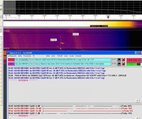 Despues de las pruebas en el entorno del laboratori, llega el turno de usarlo en radio real. Este es es resultado de recepción de la transmisión en Opera generada por Arduino (TX EB1HBK -Orense-, y RX EA1FBU -Pontevedra-, sin visión directa):