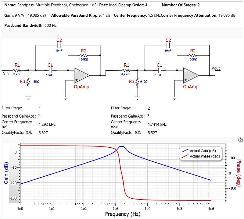 Éste es el filtro en cuestión, al final opté por una configuración Múltiple Feedback, pues la respuesta me gusta mucho más para el propósito que nos ocupa. Por cierto, si miramos más arriba, en la gráfica real, se aprecia perfectamente que los resultados son muy aproximados a los calculados. Recomiendo utilizar resistencias de precisión, aunque lo ideal sería utilizar potenciómetros multivuelta, así podemos hacer luego el ajuste de una forma muy sencilla.