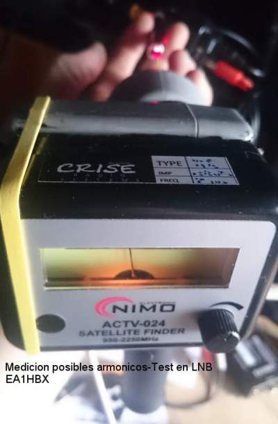 La primera foto,una pequeña comprobación como la del experimento de la‭ ‬web de Anilandro‭ ‬para detección de microondas o fuentes de ruído como tal,‭ ‬con un detector que consta de un‭ LNB satelital‭ ‬,una‭ ‬aguja de‭ “‬s-meter‭”‬,‭ ‬y un simple láser rojo frontal.‭ ‬Ésta es la preliminar primera prueba,‭ ‬aquí es muy difícil apreciar señales procedentes del láser,‭ ‬a pesar de la alta sensibilidad y ganancia del lnb‭ –‬sobre‭ ‬50dB-‭ ‬y comprobando a ver si por casualidad nos‭ “‬cae algún armónico‭” ‬en el margen de recepción entre los‭ ‬10‭ ‬a‭ ‬14‭ ‬Ghz.‭Ruído, ‬Pero poco o inapreciable a simple vista.Lógicamente, el láser se alimenta con DC y no se modula,se presupone que no aparecerán en este caso.‭‬Veamos.‭