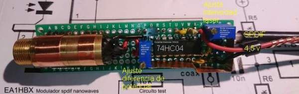 El circuito consta de un modulador TTL con puertas lógicas a través de un hex-inverter‭ ‬74hc04‭ ‬trabajando con cinco puertas en paralelo atacando un mosfet de salida con control de corriente y tensión para darle la especificación de alimentación más correcta al láser verde de‭ ‬5‭ ‬mW.‭ ‬La entrada de señal es digital procedente de un convertidor ADC spdif modulado analógicamente con una señal de prueba stéreo y música reproducida desde un lector de Mp3.‭ ‬Podemos constatar que estos diodos láser,‭ ‬quizás se comportan como cualquier otro al ser atacado con señales variables analógicas o digitales,‭ ‬generan armónicos en un gran espectro de frecuencias:‭