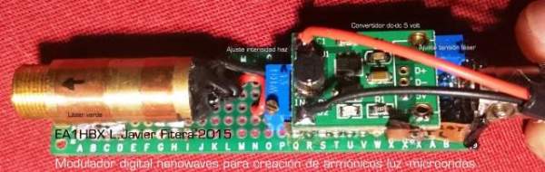 El montaje de las puertas lógicas para el modulador nanowaves‭ ‬,‭ ‬por dentro:‭ Vemos a la izquierda un láser verde de‭ ‬5mW común de los chinos como emisor de luz,‭ ‬y el resto de los componentes,‭ ‬a la derecha,‭ ‬la entrada de señal digital y alimentación de‭ ‬5‭ ‬volts:‭ Encendiendo motores.‭ ‬He añadido convertidor DC DC‭ ‬para uso con baterías Li-ion de‭ ‬3,7‭ ‬volts a‭ ‬5‭ ‬volts‭ ‬:‭