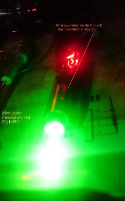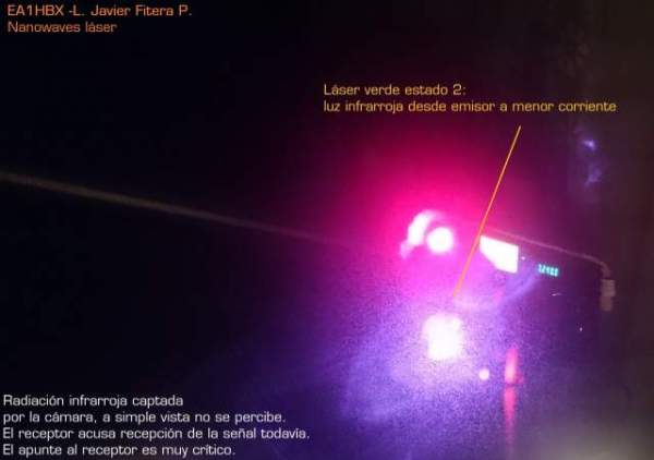 En la siguiente foto,vemos el‭ ‬“segundo estado‭” ‬ajustando el láser emisor,‭ ‬ajustando el valor de los potenciómetros‭ ‬,con una regulación decreciente de la corriente a través del diodo láser.‭ ‬Éste se apaga…o parece.‭ ‬A simple vista no se percibe emisión de luz verde.‭ ‬Sólo la cámara de fotos percibe la emisión de un haz infrarrojo de fondo‭ ‬por la característica de incorporar un filtro de entrada de su ccd‭ ‬.En plena transmisión,‭ ‬el receptor todavía recibe el ruído del emisor‭ ‬distorsionado,‭ ‬con apunte muy crítico:‭ En la siguiente,‭ ‬el estado‭ “‬3‭” ‬ajustando los potenciómetros con corriente reducida a través del láser‭ ‬.‭ ‬Se puede ver en la foto‭ ‬un emisor láser rojo auxiliar superior para conseguir mejor apuntado al receptor,‭ ‬ya que el infrarrojo de nuestro prototipo no es posible el apuntado a simple vista.‭ ‬Nuestros ojos‭ “‬ya no ven‭” ‬a dónde se dirige el haz.‭