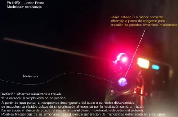 Sorpresa‭! ‬Casualmente‭ ‬,‭ ‬al moverme mientras hacía los ajustes,‭ ‬se escuchaban sobre el altavoz del receptor,‭ ‬una‭ ‬señal de pulsos como un rádar,‭ ‬variando de velocidad según me moviera al lado del emisor.‭ En éste, casi no se percibe el haz infrarrojo a través de la cámara de fotos,‭ ‬a simple vista nada de nada.‭ ‬Pero algo se está transmitiendo desde el láser,‭ ‬o en una longitud de onda armónica todavía más baja que el infrarrojo.‭