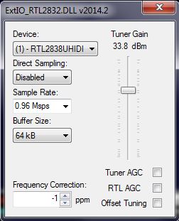 Para no hacer enorme este tutorial, suponemos que no se parte de cero y que ya se ha utilizado alguna vez el programa HDSDR con un RTL-SDR. Entonces ya nos aparece la ventana de Ext-IO donde configuramos el RTL Es importante desactivar los AGC del RTL y dejar la ganancia en un punto medio, tal que así
