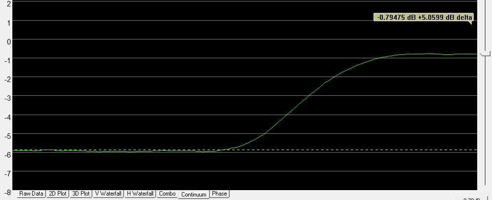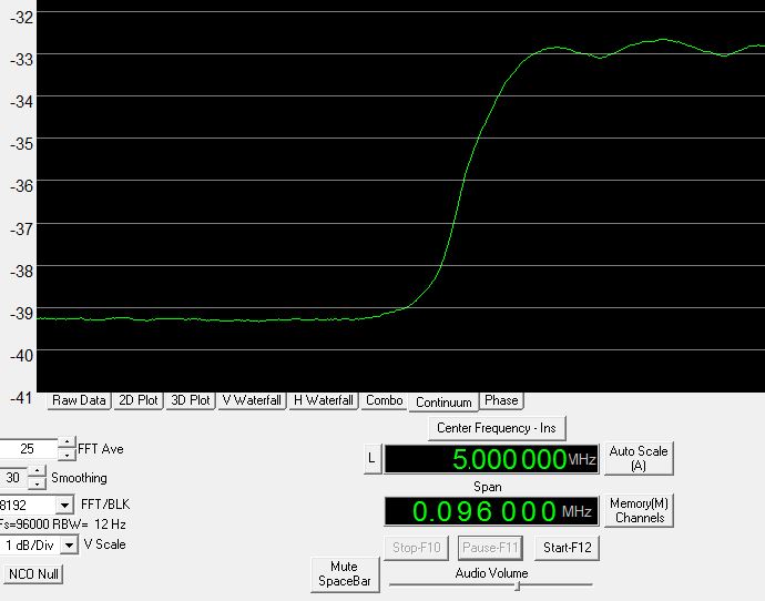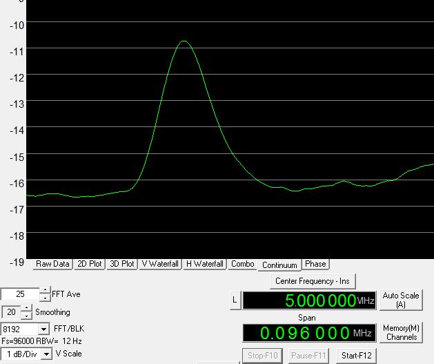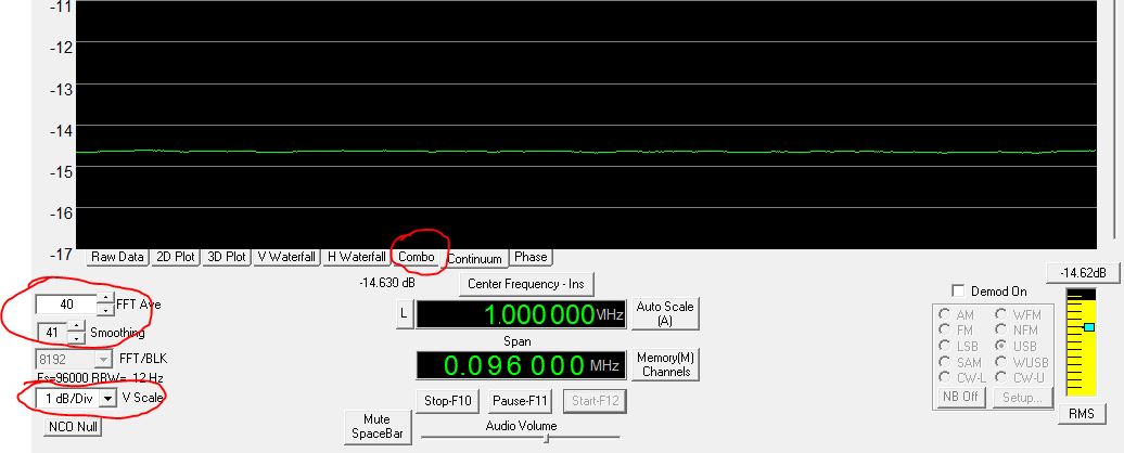 En la pantalla principal seleccionamos también un Span de 96000. El tipo de gráfico es el Continuum Y a la izquierda tenemos algunos controles importantes. Sobre todo el VScale, que nos va a definir la sensibilidad vertical del gráfico. Para medir señales fuertes como el sol lo podemos poner a 1dB/División. Pero si nuestra antena es pequeña o queremos medir un sistema poco eficiente podemos reducir hasta 0,1dB/División En ese caso cualquier pequeña variación de ruido genera picos en la señal. Para conseguir una respuesta mas sueve hay que jugar con los valores de Smoothing y FFT Average. EL valor de FFT/BLK se traduce aquí en que la respuesta del gráfico sea mas rápida o mas lenta