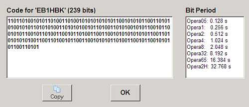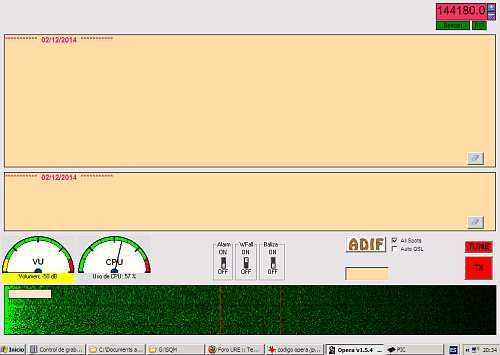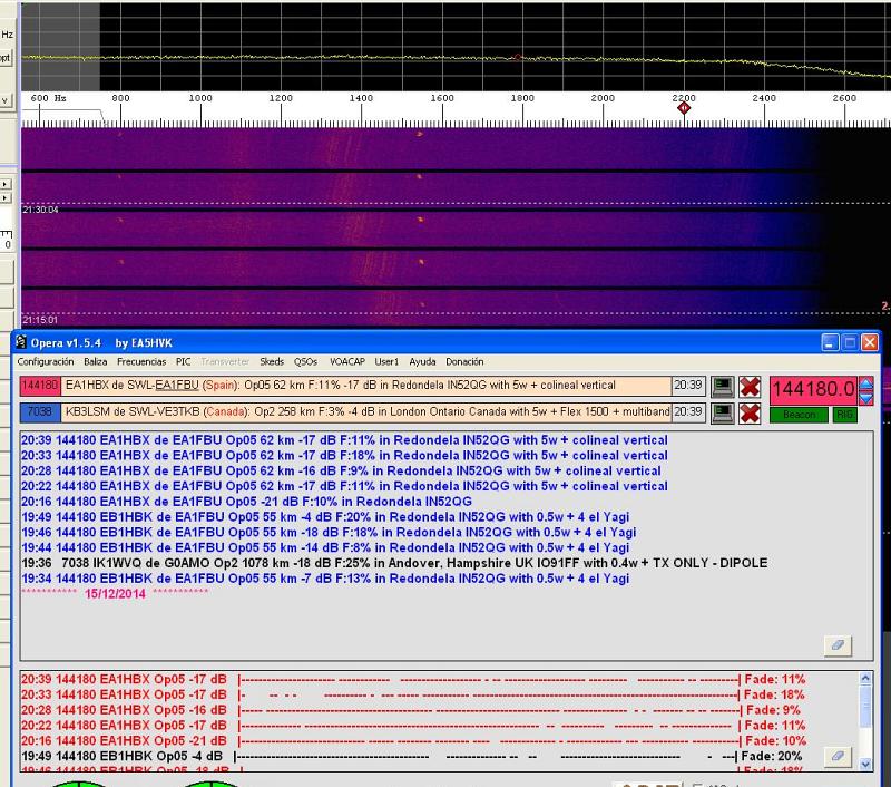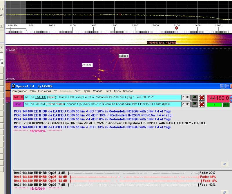 Le reduje el número de tramas Opera a uno y el tiempo de espera entre tramas opera a 20 segundos. Así se parece mas a una baliza estándar IARU. Aun hecho en falta el periodo de portadora continua. Es muy importante cuando se trata de identificar una baliza muy débil en el waterfall y no es una señal decodificable