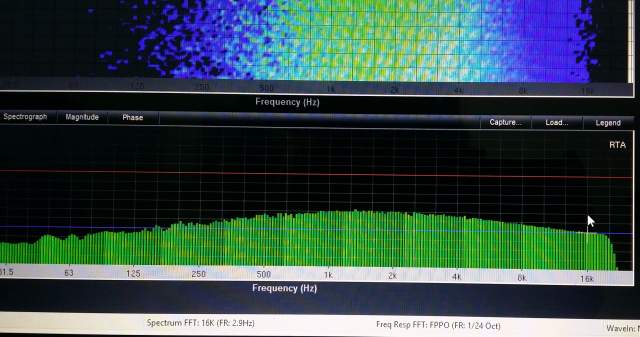 Pruebas de un filtro pasobanda de primer orden RC muy simple, con f0=1500Hz, y con un paso de banda de -3dB entre 650Hz y 3600Hz aproximadamente. Ésta respuesta mostrada es ruido rosa pasando por el filtro.