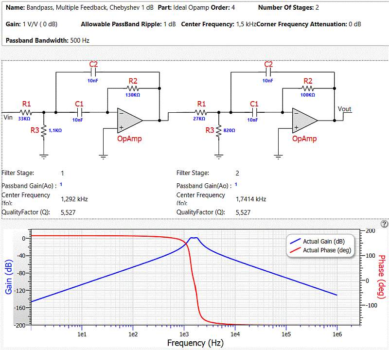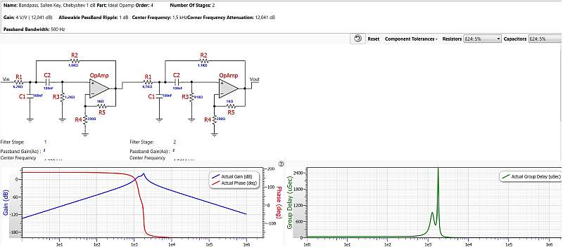Estoy trabajando en otro filtro, pero activo, el cual probaré tan pronto prepare la PCB. Aquí pongo una muestra de un primer diseño, aunque lógicamente, irá teniendo cambios según vayan saliendo los cálculos.Éste diseño es una célulaSallen Key.