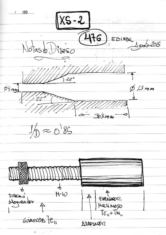 Con idea de “estirar” las posibilidades del material disponible e investigar a continuación las bondades de este tipo de bocinas, surgió la XS-2, un modelo con un apertura ligeramente mayor que la XS-1 y haz mas estrecho. Adecuado para reflectores con f/D alrededor de 0,85. La sección dual-mode puede ajustarse en longitud para modificar el desfase entre ambos modos y disponer así de una manera simple de valorar el comportamiento práctico del modelo calculado.